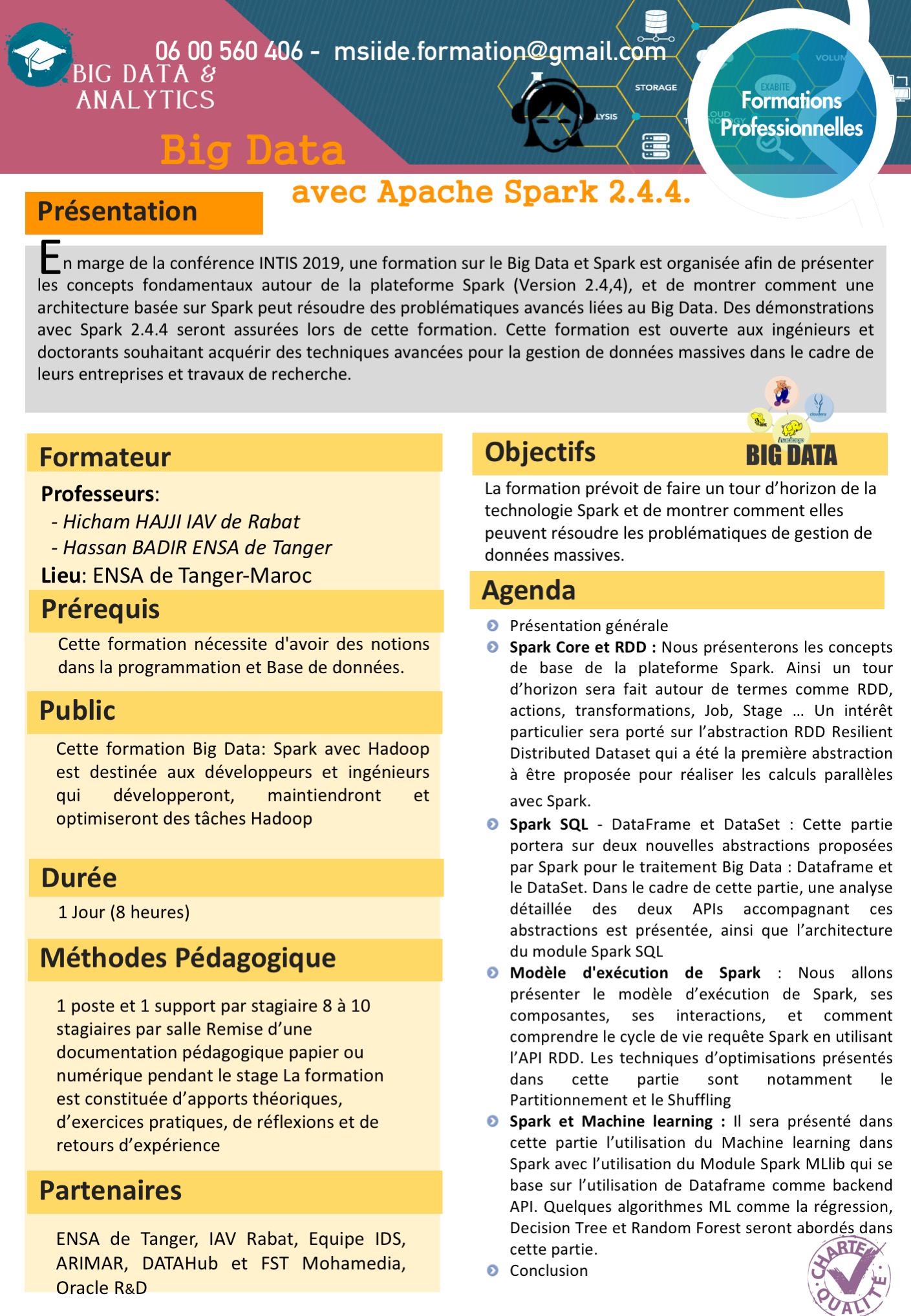 - Au marge de la conférence INTIS 2019, une formation sur le Big Data et Spark est organisée afin de présenter les concepts fondamentaux autour de la plateforme Spark (Version 2.4,4), et de montrer comment une architecture basée sur Spark peut résoudre des problématiques avancés liées au Big Data. Des démonstrations avec Spark 2.4.4 seront assurées lors de cette formation. Cette formation est ouverte aux ingénieurs et doctorants souhaitant acquérir des techniques avancées pour la gestion de données massives dans le cadre de leurs entreprises et travaux de recherche.